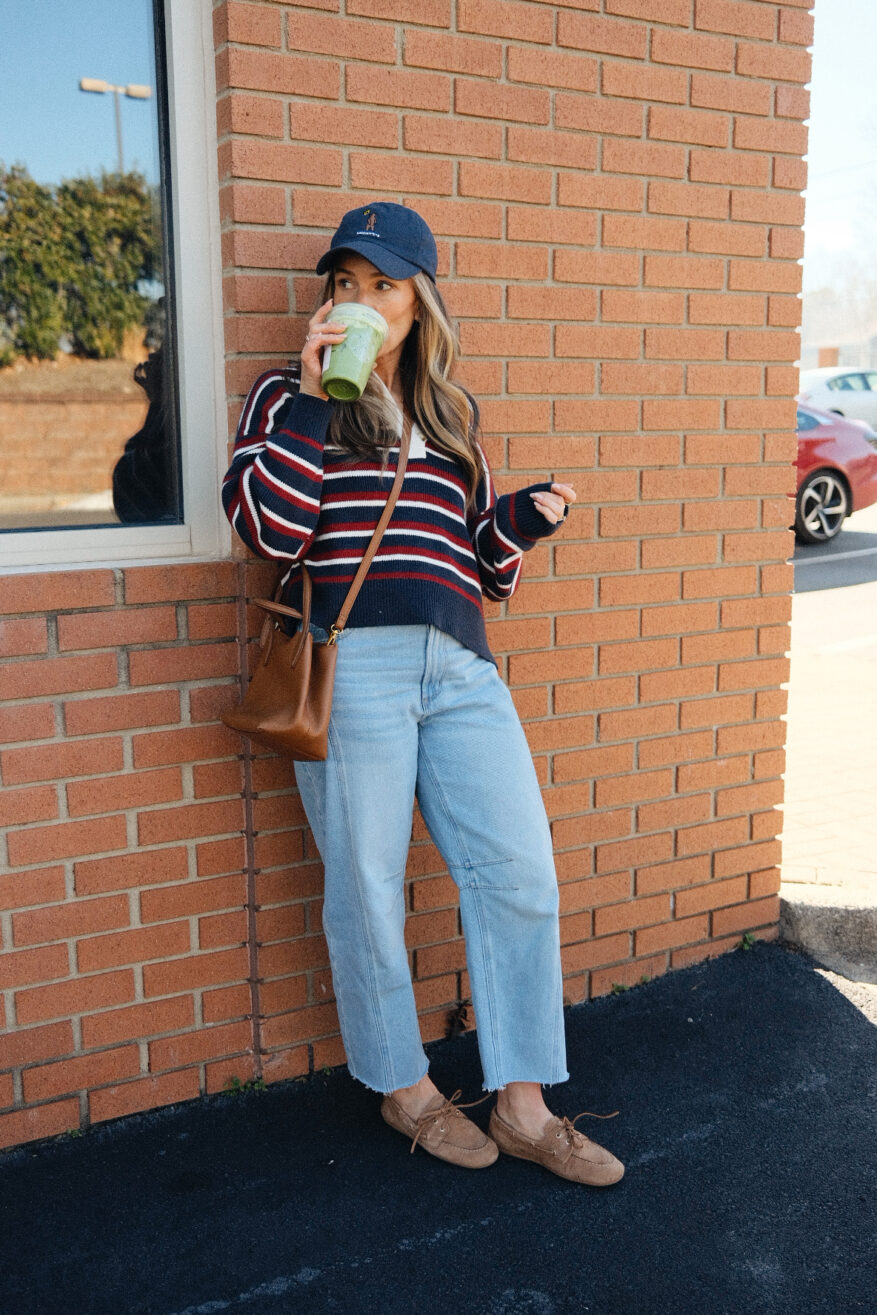 A rugby stripe sweater or polo with wide-leg or barrel light wash jeans and boat shoes is the outfit that started this whole post. It’s a classic preppy style combination that looks polished without being overdone. You can swap jeans for denim shorts and a long sleeve for a short sleeve polo for warmer weather and the look will translate perfectly. Add a navy baseball cap to make it the perfect casual boat shoe outfit.